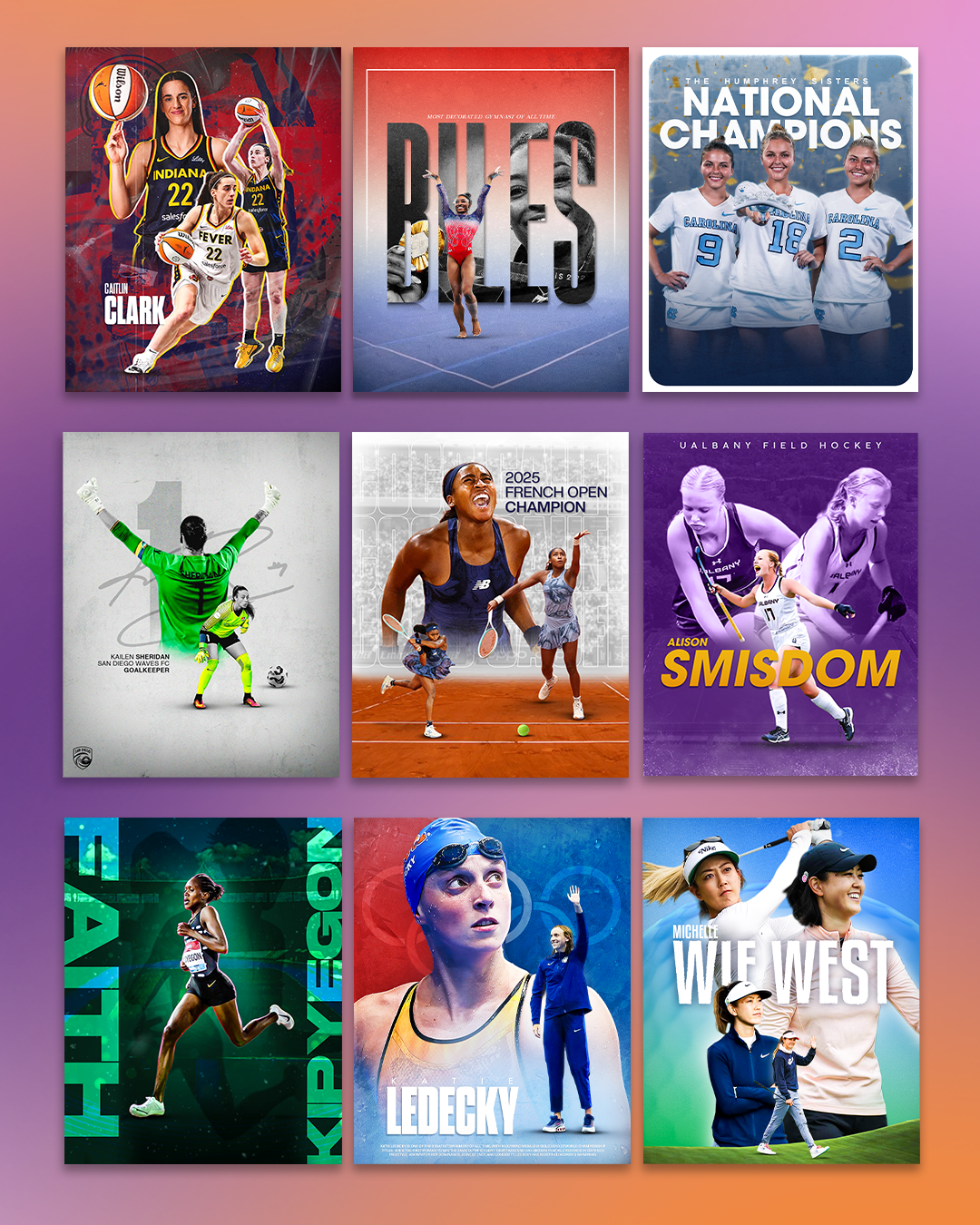 During summer 2025, I challenged myself to a 9-week design series: creating one sports graphic every week, each one spotlighting a different female athlete. Some weeks I've created a couple different variations of the same graphic. The goal was to push myself creatively, try new styles, and learn new skills in Adobe Photoshop. Each week I pull inspiration from other sports graphics I admire and watch tutorials to help learn new techniques. Each graphic is an opportunity to step outside my comfort zone, intentionally grow my skill set and build my confidence as a designer.